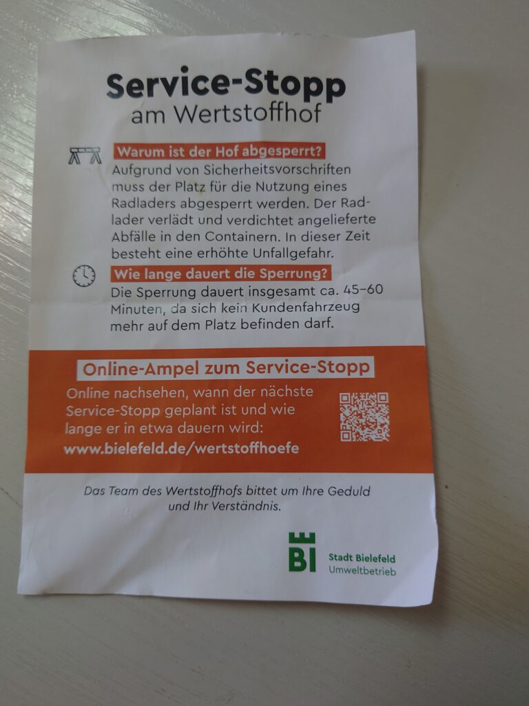 noch nicht ganz drin in der neuen Welt bietet die Stadt Bielefeld sogenannte Service-Stopps an. Gemeint sind zusätzliche Pausen der Mitarbeiterinnen und Mitarbeiter (sowie der Bürgerinnen und Bürger) auf den Wertstoffhöfen der Stadt.
